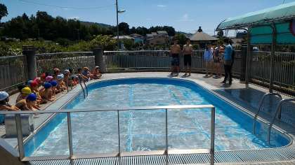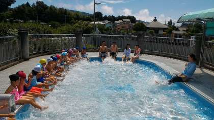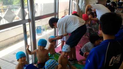 写真下:次にプールに入る子たちの準備です。帽子をかぶる、といった自分の目に見えないところの手作業はまだ大変なんですね。