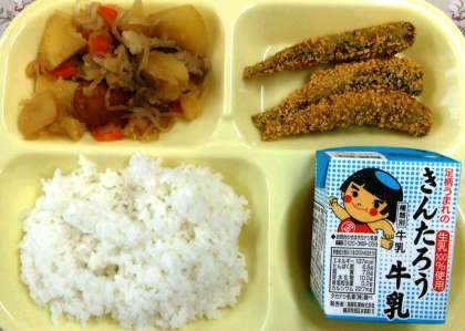 今日の給食のメニューは、鰯のカリカリフライ、ジャガ芋としらたきの炒り煮、ご飯、牛乳です。