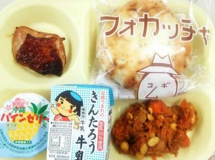 今日の給食のメニューは、鶏肉のレモン醤油焼き、チリコンカン、フォカッチャ、牛乳、デザートです。