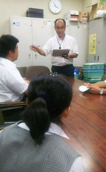 写真(上)は、事前説明をする宮坂宗篤指導主事さんの話をしっかりと聞いている蛭海さんの後ろ姿です。