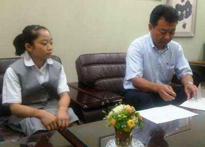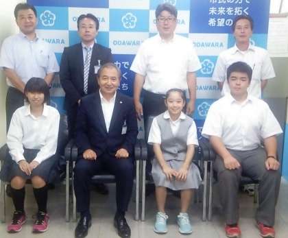 8月の全国中学校体操大会に出場した2年生の蛭海和さんが、栢沼行雄教育長さんを訪れ、関東大会と全国大会出場の報告をしました。蛭海さんだけでなく、写真(下)のように他校(国府津中の陸上、鴨宮中の卓球)の全国大会出場者も一緒です。