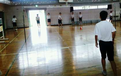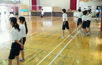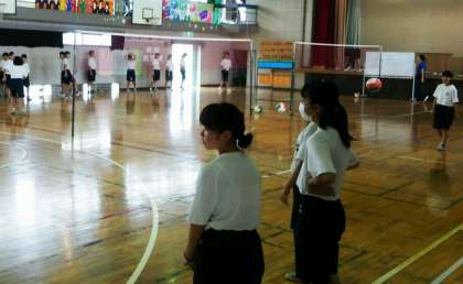 体育館では伏見まり先生の「バレーボール」の授業を行っていました。写真は、サーブの練習風景です。男女仲良くできていて千代中らしくてとてもいいです。