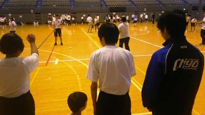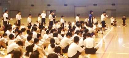写真(上)は、開会式の様子です。千代中学校の紹介を上手に発表できました。