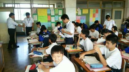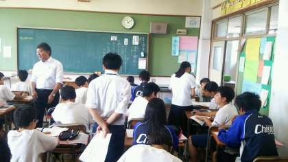3校時は、鈴木元子先生と松本雅人先生の1年4組のTTの授業です。小畑教頭先生も入りスピーチの骨子作りに手助けしてくれました。
