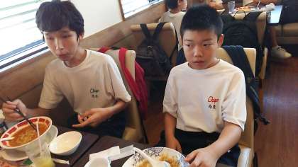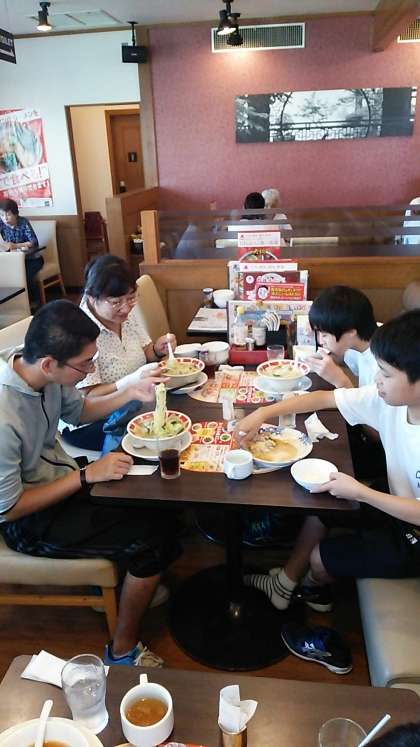 写真(中、下)は、自分で頼んだメニューが運ばれ、美味しそうに食べているところです。いつもの給食と違い、飲み物も好きなものを選べて、なんだか嬉しそうでした。クラスメイトと一緒に外食する機会はほとんどどないので、会話も弾みます。