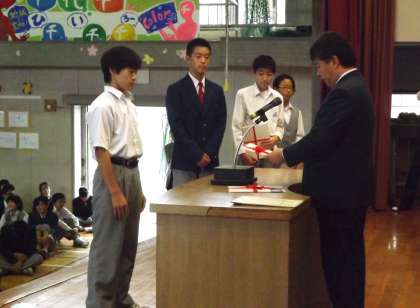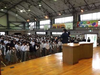 午前中4校時の授業を行ったあと、午後から前期終業式を行いました。今日は校長先生が午後から出張だったため、教頭先生から通知票を手渡していただきました。教頭先生のお話では、4月から半年間をふり返り、いろいろなことがたくさん有った学校生活、そして多くの人たちに感謝の気持ちを持って過ごしていきましょう、とのお話しがありました。今日で今年度も折り返し、残りの半年の日々を大切に過ごしていって欲しいと思います。