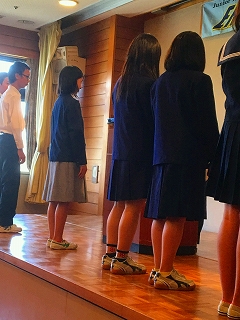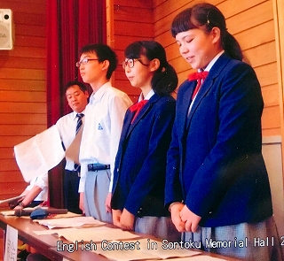 写真(上)は、表彰式の後姿です。写真(下)は、司会進行をした千代中3人と木村先生です。