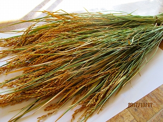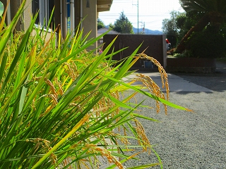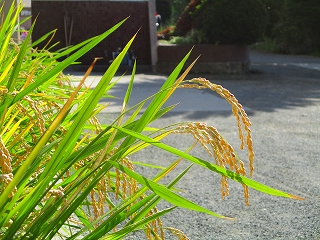 千代中の周りの田んぼは、稲刈りが進行中ですが、校長室横の稲たちは少しずつ新妻先生が刈り取っています。