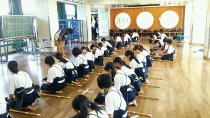 写真は、日渡雄太先生の「剣道」の授業風景です。「礼」という号令で、挨拶しているところです。『礼に始まり、礼に終わる』剣道の授業です。