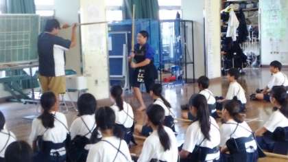 写真(下)の面打ちの模範演技は、江口くんです。さすが剣道部の江口くん、とても上手です。