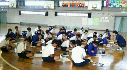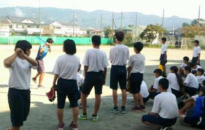 写真(下)が、石井豪先生の「Tボール」の授業でのバットの振り方を指導しているところです。このあと、私の姿に気づいた生徒たちは大きな声で「こんにちは〜」と気持ちよい大きな声で挨拶してくれました。