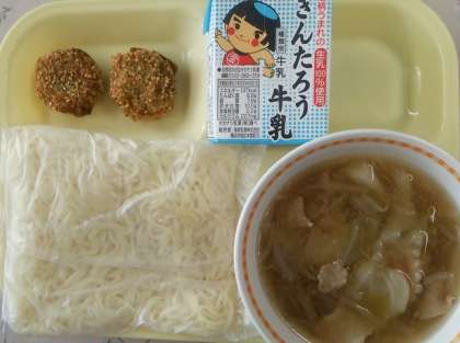 今日の給食のメニューは、サンマー麺、南瓜のゴマフライ、牛乳です。