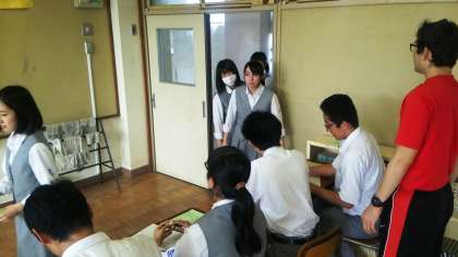 写真(下)は3年1組の生徒たちが投票所に来たところです。