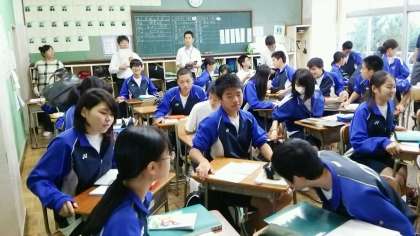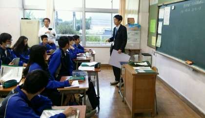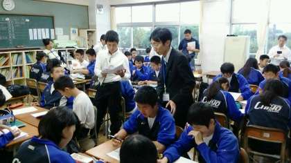 写真は、1校時の高木清司先生の授業研究の様子です。3年5組の家庭科です。今日は小田原市教育委員会の松澤俊介指導主事さんにお越しいただき、指導助言をしていただきました。