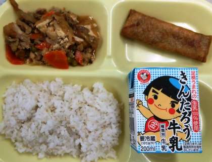 今日の給食のメニューは、春巻き、生揚げの中華風煮、麦入りご飯、牛乳です。
