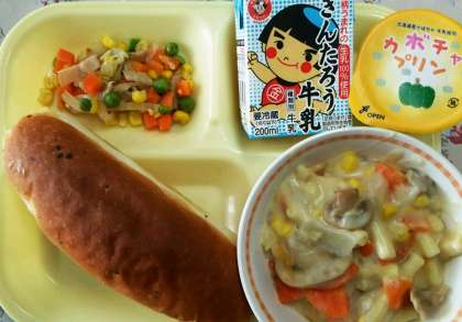 今日の給食のメニューは、マカロニのクリーム煮、カラフルソテー、チーズパン、牛乳、デザートです。