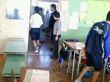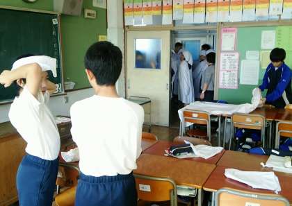 写真は、2年1組の準備風景です。担任の鰺坂由香先生も一緒に配膳をしていました。というより4校時が体育だったため、給食当番はまだ教室に戻ってきておらず、鰺坂先生はちょっと寂しそうでした。