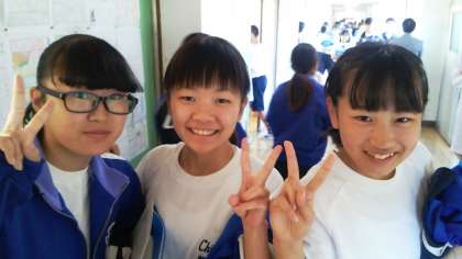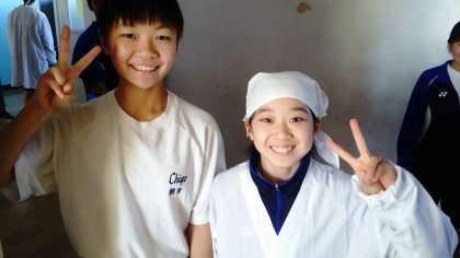 1組の前が給食室なので、当番が揃うのを待ちながら写真を撮りました。笑顔がとてもいいです。
