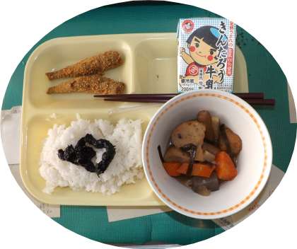 今日のメニューは、ご飯、ひじきとのりの佃煮、いわしのカリカリフライ、おだわらっ子おでん、牛乳です。