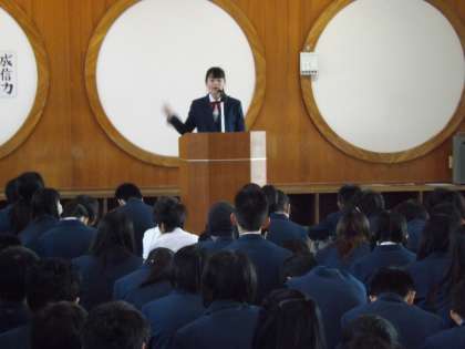 1校時に2年生は英語発表会を行いました。「こんな人になりたい」をテーマに、スポーツ選手や部活の先輩、おじいちゃん 等、尊敬する人について10人の生徒が英語でスピーチしてくれました。自分の考えを多くの人の前で発表するのは日本語でも難しいものですが、それぞれが立派に発表してくれました。そして最後のスピーチは英語科の山田先生について、いつも笑顔で接してくれる山田先生みたいになりたい、という内容でした。山田先生と亀井先生の英語の授業が、生徒たちにとって楽しい時間だということが感じられる発表会でした。