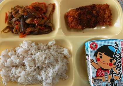 今日の給食のメニューは、イカのフライ、きんぴらごぼう、麦入りご飯、牛乳です。