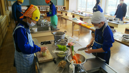 大根、人参、玉ねぎ、しめじ、ごぼう、里芋、こんにゃく、長ねぎ、豆腐を食べやすいサイズに切り、煮込んで作りました。約50食出来上がりました。