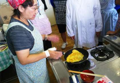 写真は、その様子です。写真(中)、末藤千鶴先生がお手本で“薄焼きタマゴ”を焼いています。