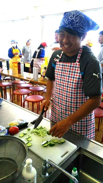写真(下)、中山望先生も笑顔でキュウリを切っています。