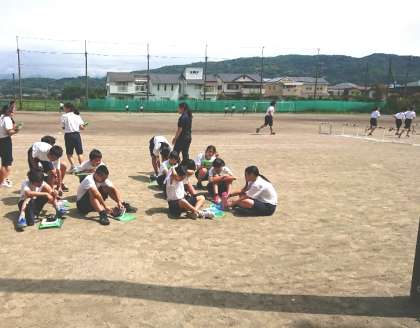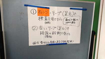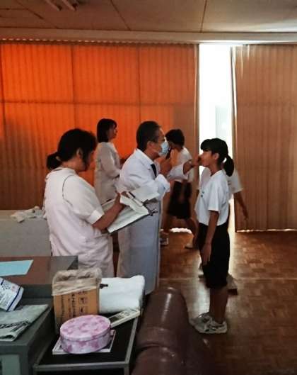 今日は、学校眼科医の高橋先生による「眼科検診」です。一つクラスで約5〜6分で終了します。写真(下)は2校時目の体育でウォーミングアップでグラウンドを走ったあとですが、眼科検診となりました。
