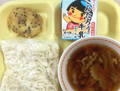 今日の給食のメニューは、五目うどん、はんぺんの石垣揚げ、牛乳です。