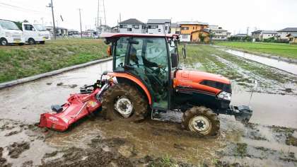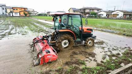 “代掻き”は『田起こしのあとに田に水を張り、土を細かく砕き、掻き混ぜ、田の表面を平らにする作業。代掻することで、1.苗を植えやすくし苗の活着と発育を良くする 2.土の表面を均すことで苗がむらなく生育するようにする 3.藁・雑草・元肥をむらなく混ぜ込む 4.雑草の種を深く埋め込むことにより雑草の発芽を抑える 5.有害ガスを抜く 6.有機物の腐熟の促進…などの効果がある』そうです。
