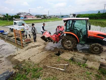 写真は、17日(日)に、上府中まちづくり委員会の皆さんが「千代中カントリーファーム」の“代掻き”をしたいただいたときの写真です。