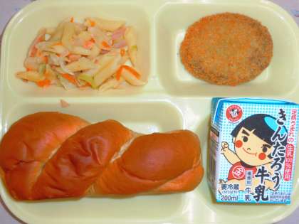 今日の給食のメニューは、ツイスト黒パン、チキンメンチカツ、キャベツのペペロンチーノ、牛乳です。
