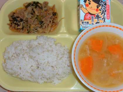 今日の給食のメニューは、スタミナ丼(麦入りご飯)、夏大根の味噌汁、牛乳です。