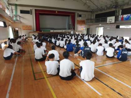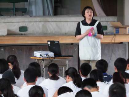 前半の15分程、養護教諭の加藤千英子先生から、体調面と気持ちの面のバランスについて話がありました。「やりたくないからやらない」「やりたくないけど頑張ってやる」など自分で選択しなければならない場面がこれからたくさんあることを問いかけていました。また、アルコールや友人関係にもふれながら、自分のことにしっかり目を向けるための話をしてくれました。