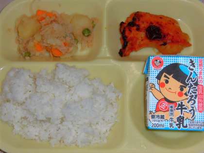 今日の給食のメニューは、ご飯、タンドリーチキン、ポテトとツナのソテー、牛乳です。