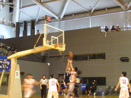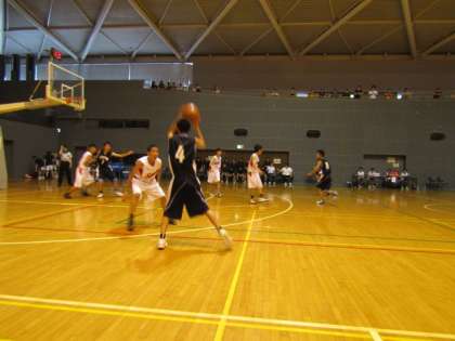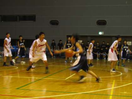 前半は、お互いに決め手を欠いた展開で接戦となりましたが、後半は千代中の攻撃のリズムがよくなり、53対27で勝利し、決勝トーナメント進出を決めました。(写真は、紺のユニフォームが千代中です)