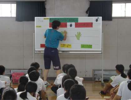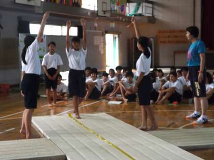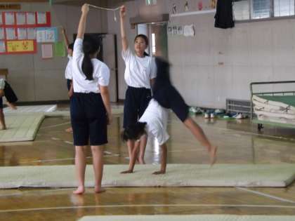 写真は6校時の4組のようすです。側方倒立回転がすでに上手に出来る生徒に手本を見せてもらうと「チリーン」とキレイに鈴が鳴りました。各グループに分かれて、回転する人、補助をする人、ちゃんと出来ているか見てアドバイスをする人を交代しながら担当し、練習をくり返しました。