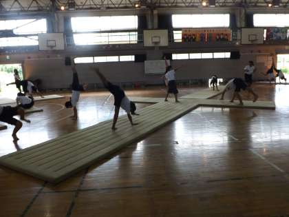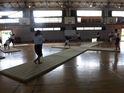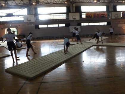 授業の最後にグループで役割をきめて集団演技を行いました。マットの上で外から中心に向かって回転をする人、マットの外で演技をする人、グループ皆で一斉に動き、最後はピタッとポーズを決めました。側方倒立回転が上手に出来る人、まだまだな人それぞれですが、集団で演技する楽しさは感じられたようです。これからも練習を積み重ねて、ピッタリとそろった集団演技を目指しましょう。