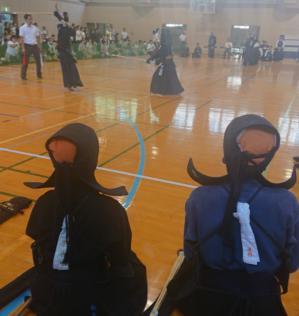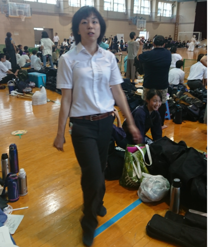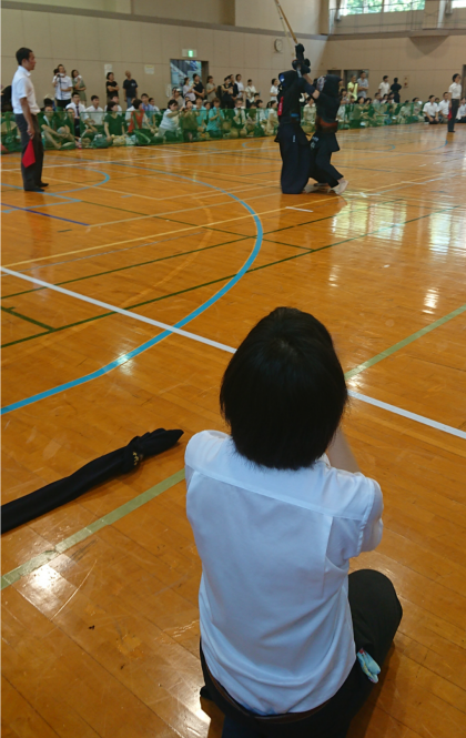 写真(上)は顧問の西山佳実先生です。先生も審判の剣道連盟の方々も暑い中頑張っています。