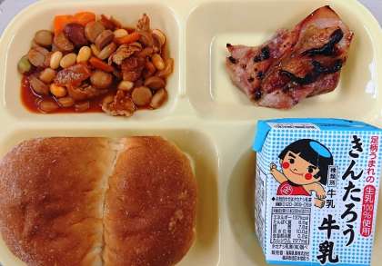 今月最後となる今日の給食のメニューは、ママレードチキン、チリコンカン、ソフトフランスパン、ミルクと全てカタカナ表記のメニューでした。
