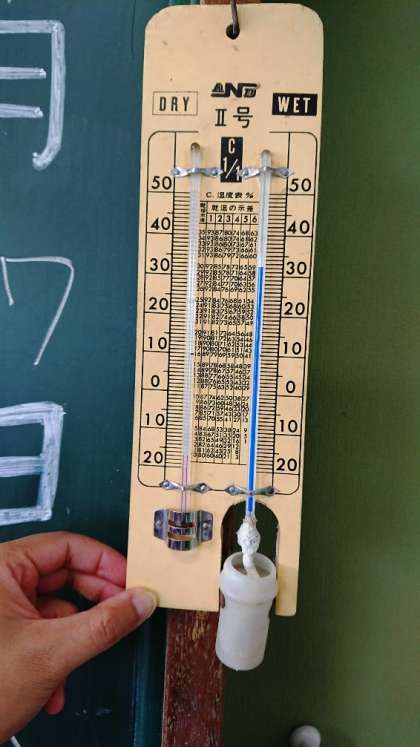 写真は、3年1組の教室の温度計です。33度です。千代中の校舎の構造上、どのフロアも1組の教室は教室前北側に配膳室があるため風の通りが極端に悪く、体感温度は40度近いと思われます。