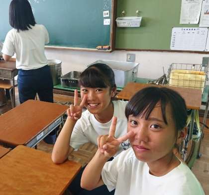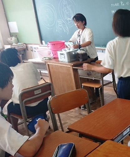 それでも写真(中)、笑顔の1組の生徒です。写真(下)、担任の鰺坂由香先生も暑さをものともせず、でも額から汗を吹き出しながら牛乳を片付けていました。