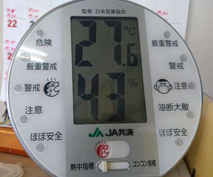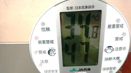 昨日までの3連休中も暑かったですが、今日は日差しがないものの、気温は高いです。校長室前の廊下に温度計を置くと、写真(上)のように34度を超えています。