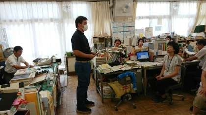 写真は、“大安”の今日、先生方皆さんからの「お祝い」を手に、お礼を述べている星野永朔先生です。