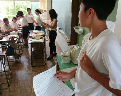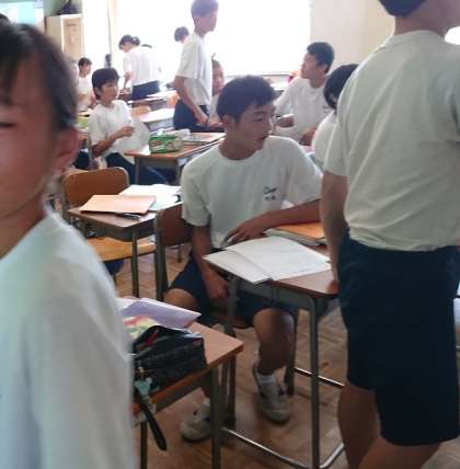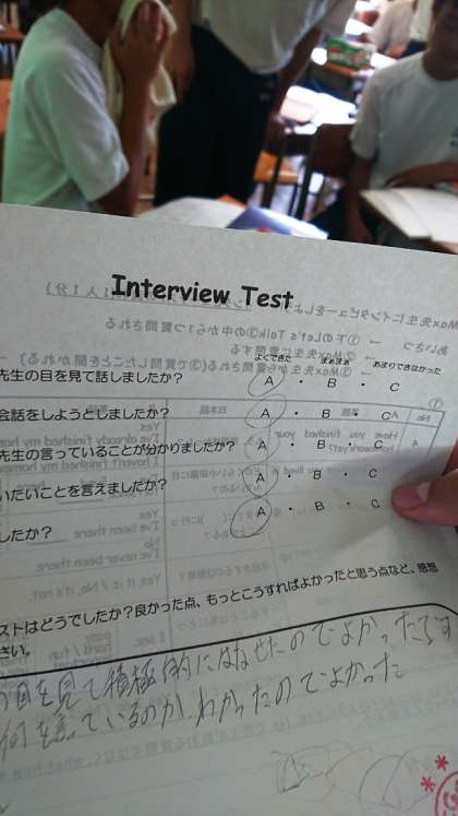 写真は、3校時目の3年1組の英語の授業風景です。先日行ったALTのマクシミリアン先生とのインタビューテストの結果を返却しているところです。