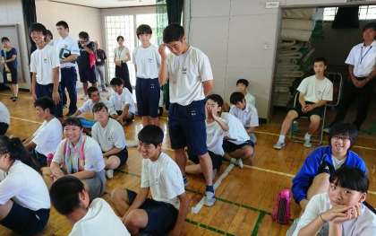 今日の2校時目は、夏休み前の全校集会です。あまりにも暑く集会を中止しようと思いましたが、生徒会による「千代中ヒーロー」の発表があり、中止せず、半袖体操服、ハーフパンツ可で、水筒持参、さらに教室でも水分補給をしっかりとしてから体育館に来る…という暑さ対策をして集会を行いました。