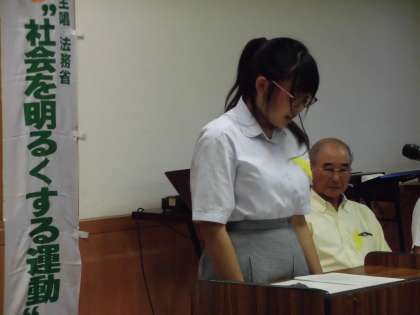 夕方6時から、川東タウンセンターマロニエにおいて、「〜第68回社会を明るくする運動〜地域の集い!」が開催され、本校の2年生柳川天音さんが作文の朗読を行いました。(写真上)