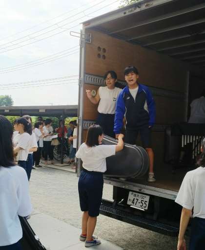 朝、学校で楽器をトラックへ積み込むところからスタートです。