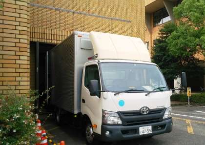 写真は、積み込みと、搬入口で楽器を降ろしているところです。